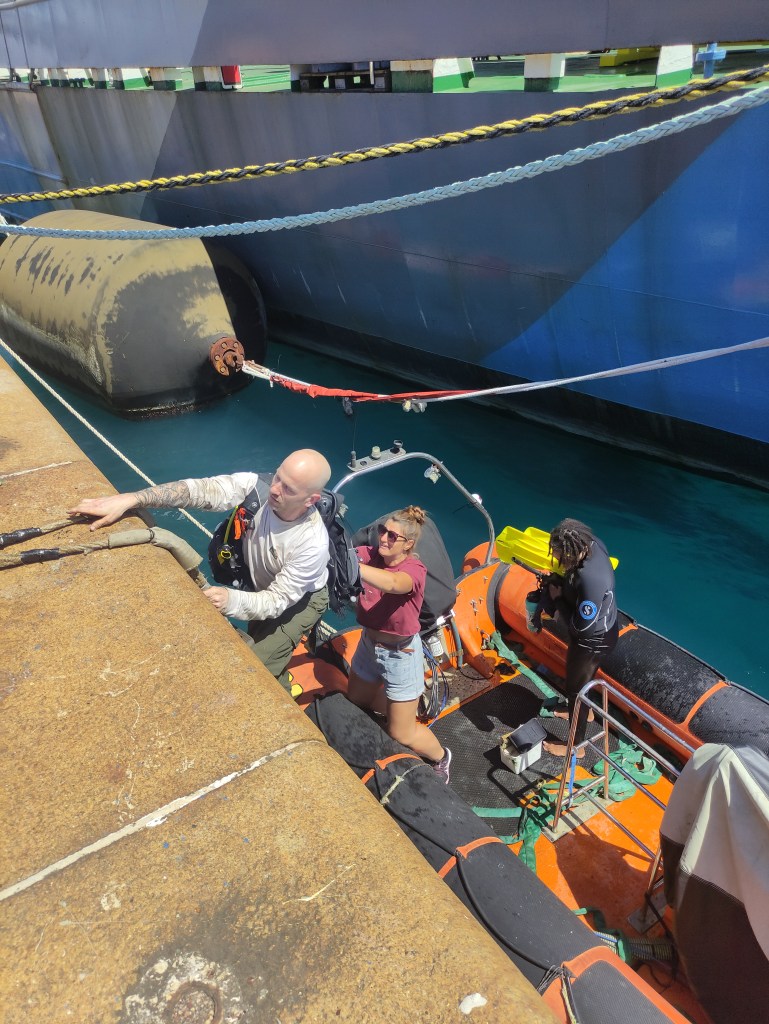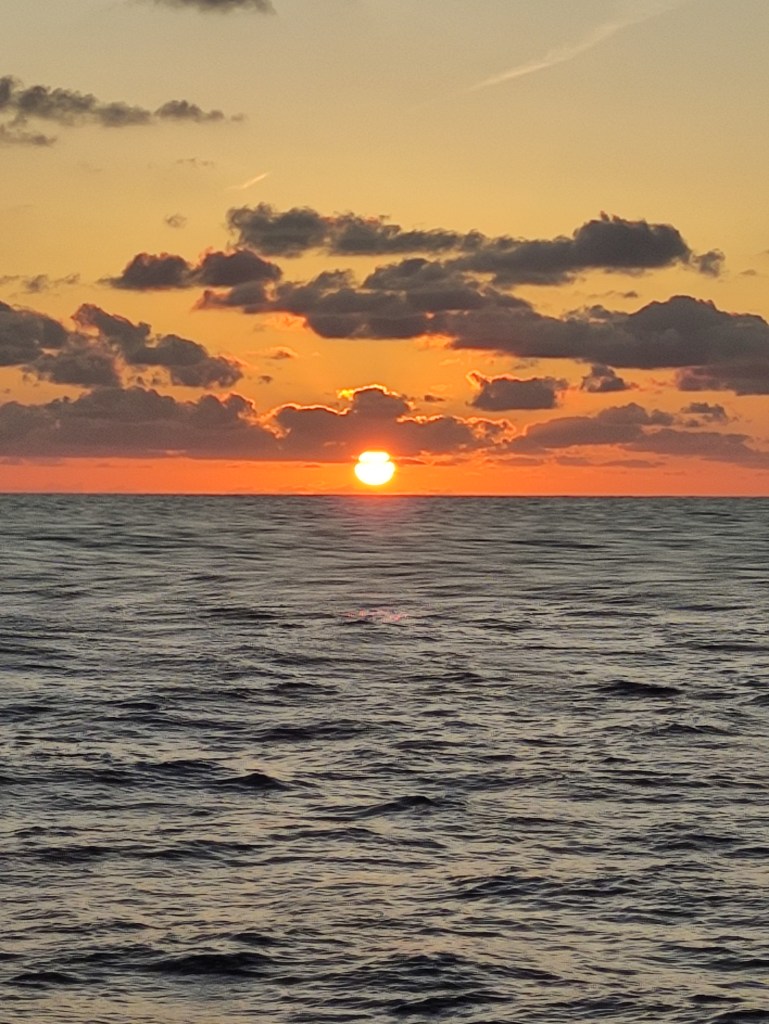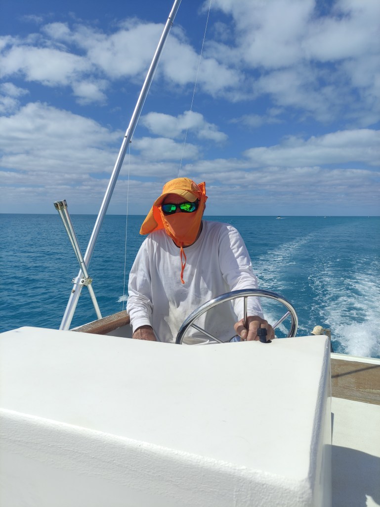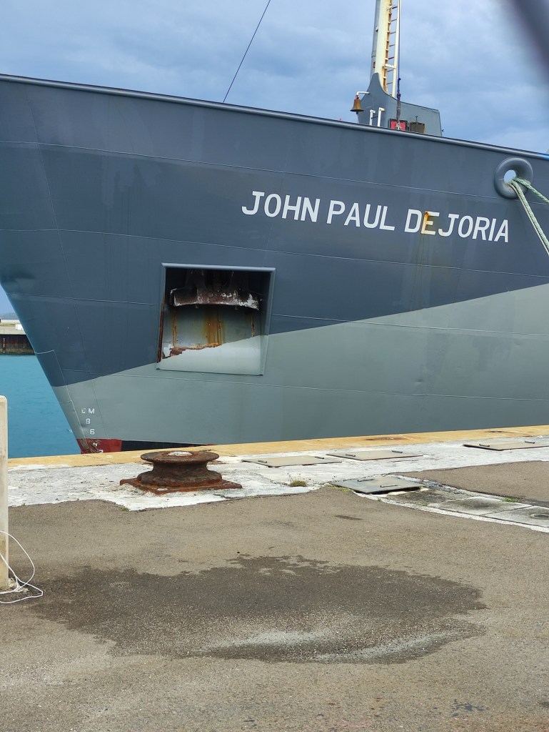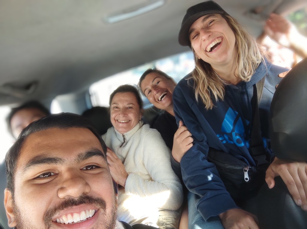 I learned a lot: from using different types of utensils to not taking offense at the haughtiness of a couple of people. It was a priority for me to make sure that there was always enough food for everyone to eat. Which meant cooking a few extra portions and having a good overview of the situation. I had to learn to cook for gluten-free (for celiacs) and with less sugar (for diabetics), something I had never done before. One evening, Captain Locky also took to the stove and surprised everyone with a delicious Brazilian feijoada! The night before departure, bosun Larry also got behind the stove and cooked a delicious vegan pizza for everyone. I always ensured that fresh bread, fruits, milk, and various nuts were available for snacks in the crew room (Mess room). But my role was not just to cook. As the days went by, a special energy developed. I found myself listening to my colleagues’ concerns and thoughts and I tried to offer them moral support: funny since that was the job I had last held for more than 25 years. Being the oldest, they called me “Mama Claudine”, and in fact, they all could have been my children. There were also some special moments, like the late afternoon of Friday, 18 April. Pedro, Juan Carlos and I took the bus to Horseshoe Beach, where we met Ray, Adélie, Chelle and Angelina. There were no more buses to take us back to the port. So, we hitchhiked. A gentleman picked up all six of us in his small car.