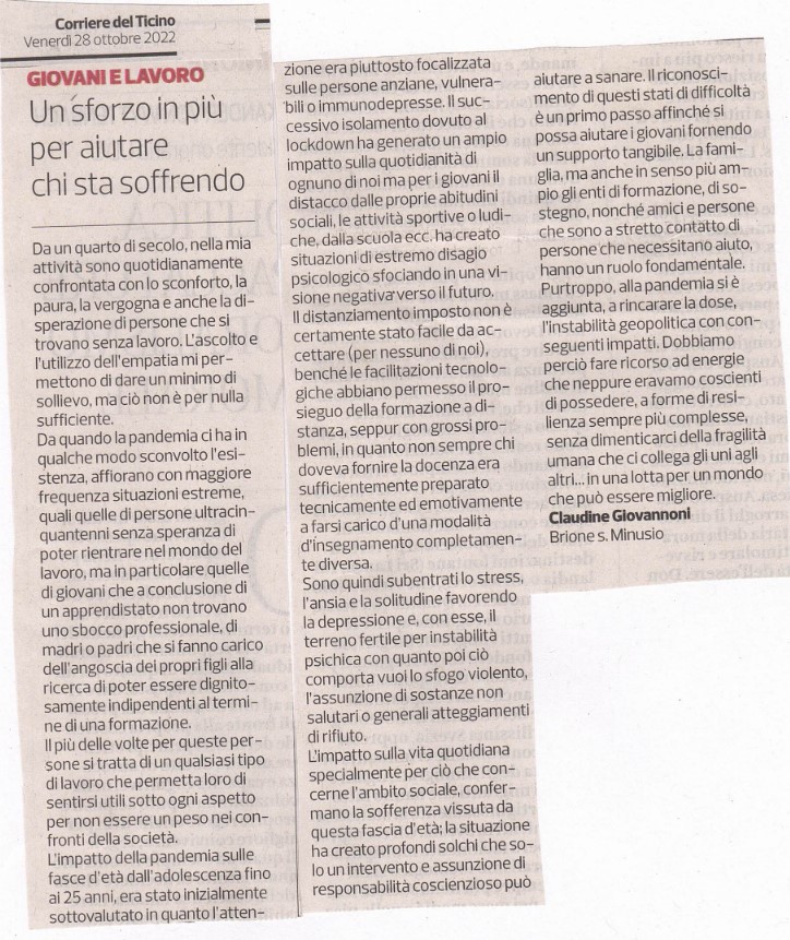 For 25 years I have been involved in the public sector in following up with job seekers. In Switzerland, the law supports unemployed people in a very substantial way, not only financially but also by offering a counseling service designed to reorient and in a practical way, help the unemployed in job placement by means of appropriate courses. The SARS-CoV2 pandemic has affected everyone with extreme virulence, but the age group of young people at the end of apprenticeship/training are the ones in a devastating situation. Initially, the focus was more on the elderly, but now, with great delay, we have realized the severity of the problem!