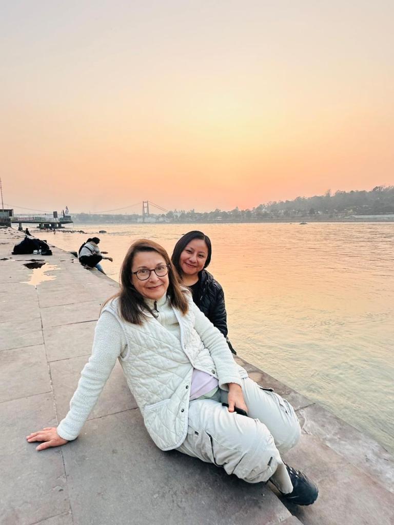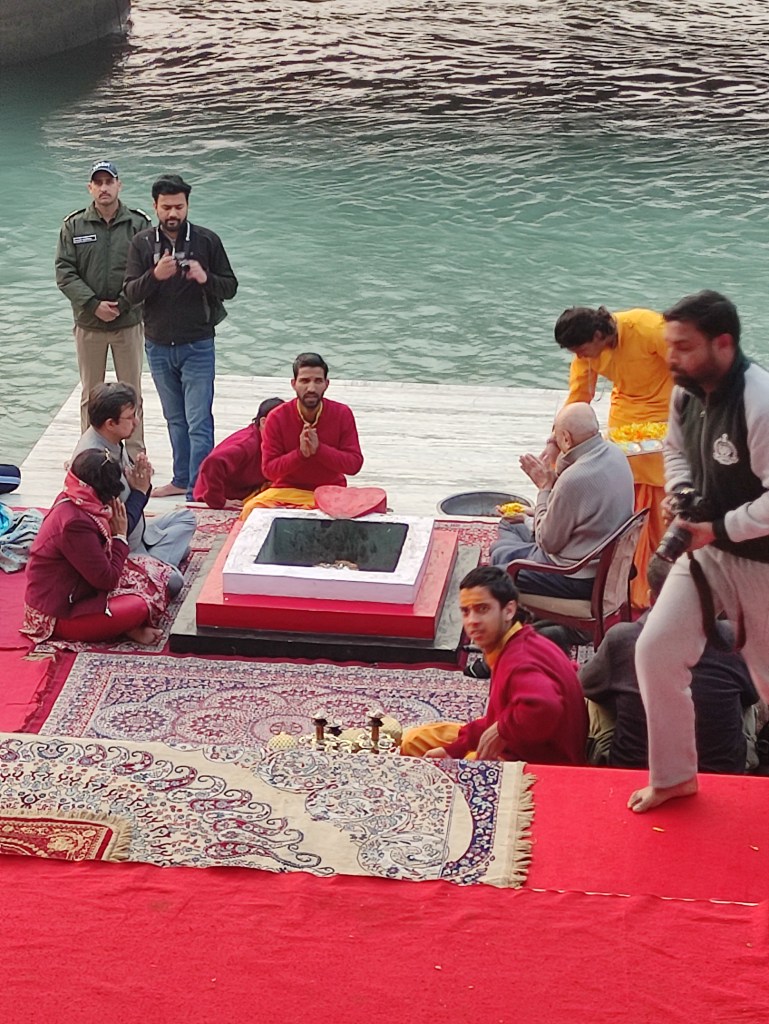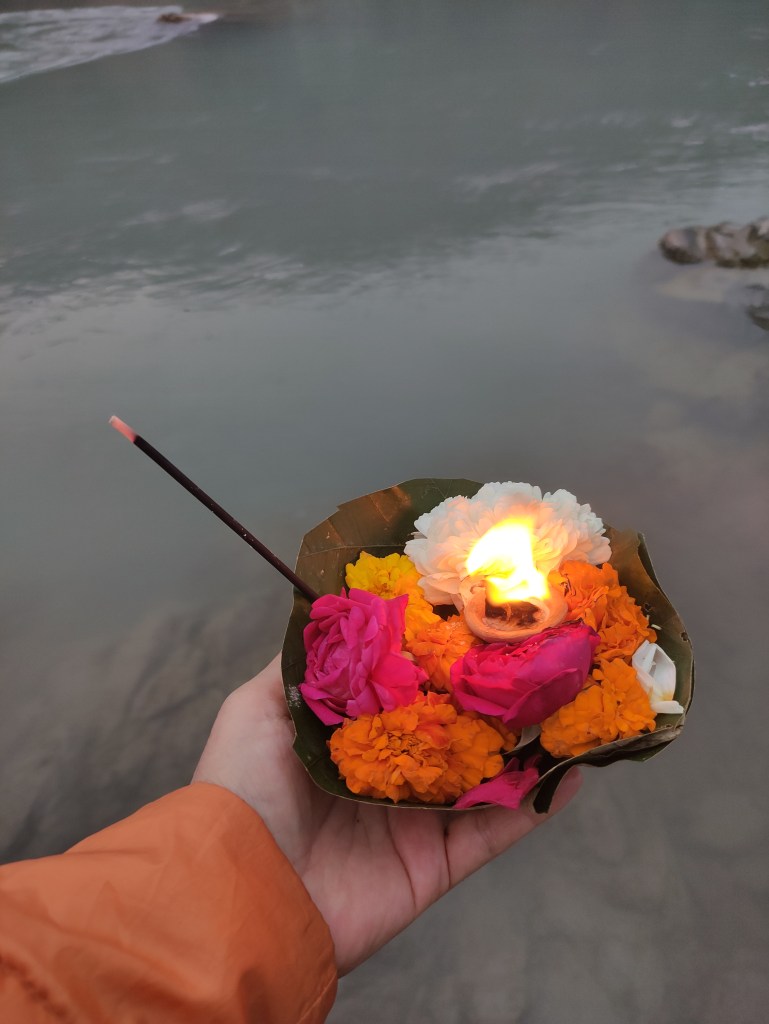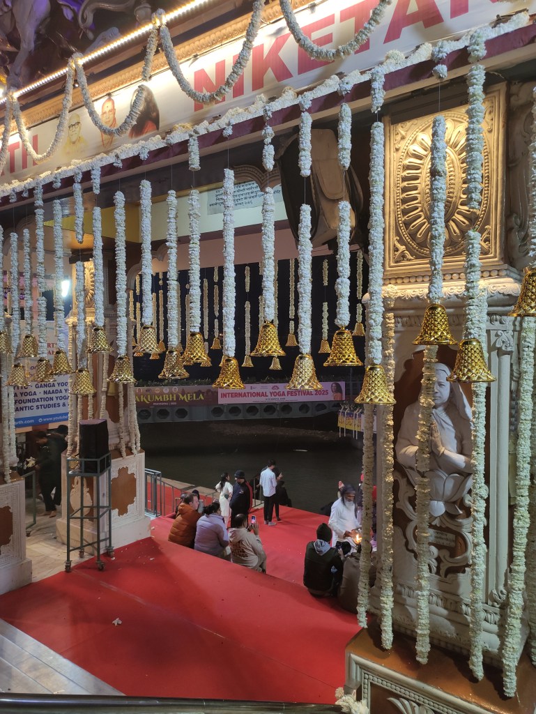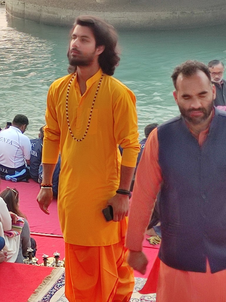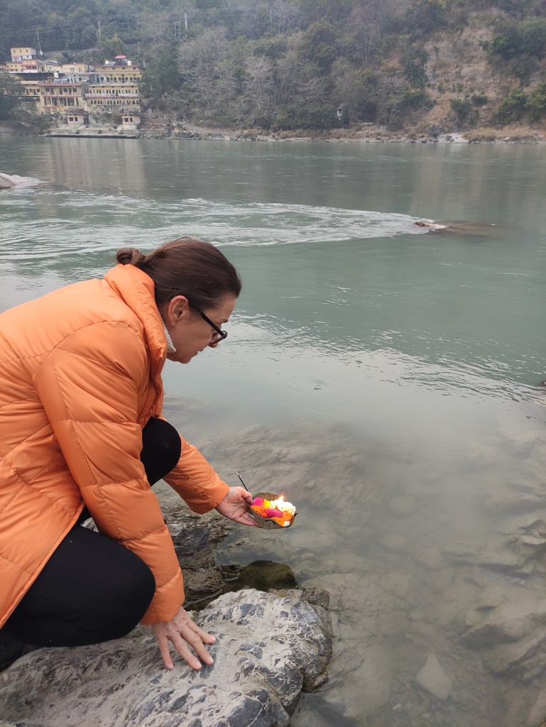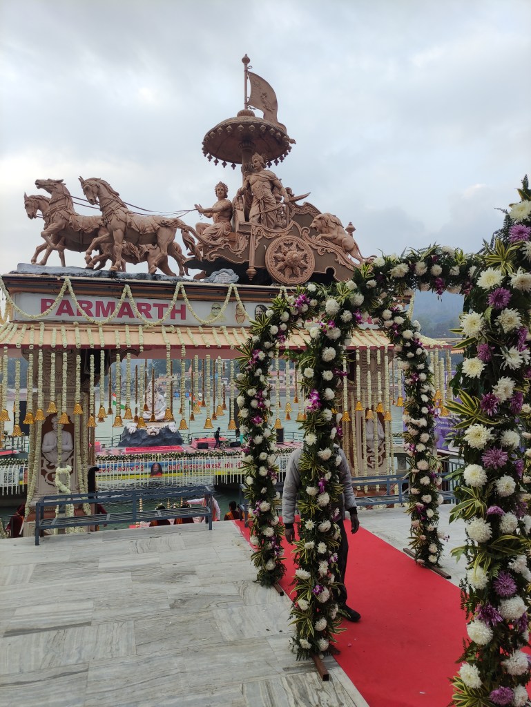 Each night at sunset, at the Parmarth Niketan Ashram there is a lovely celebration. Aarti is a sacred ritual in Hindu worship, involves the offering of light to deities as a form of devotion. It holds immense significance in the spiritual practices of Hindus, symbolizing the removal of darkness and ignorance. Historically, Aarti has deep roots in ancient Hindu traditions, evolving over centuries as a key component of temple rituals and personal worship. It is a moment of connection between devotees and the divine, imbued with profound meaning and significance.