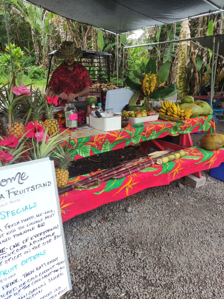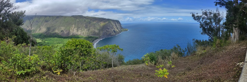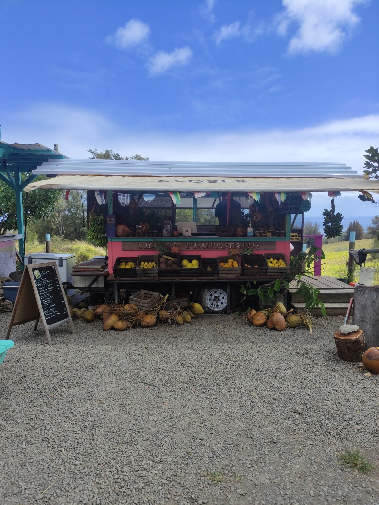 The next day, Saturday, we hiked the northwest tip around the Kohala Mountains. At Paniolo Ranch, my son made an appointment for a half-day outing on Monday morning. We went to the Pololลซ Valley Lookout, but again, we didn’t go down to the beach because the paths from the high plain to the beaches below are very steep. The descent was fine, but the climb back up takes hours. Kohala Volcano last erupted about 120,000 years ago and is the oldest of five volcanoes that make up the Big Island. Between 250,000 and 300,000 years ago, the Kohala volcano experienced a truly massive landslide, in which part of the volcano fell into the ocean. This landslide is responsible for the now-famous sea cliffs on the windward Kohala. Pololลซ Valley, Waipi’o Valley, and Waimanu Valley are the most spectacular. The entire northeastern part of the Pu’u O Umi Natural Area Reserve is very green and is crossed by about forty streams that flow from the top of Kohala volcano to the ocean. This reserve covers the west upper slopes and summits of the Kohala Mountains down to the dry coastal sea cliffs. Two rare montane bogs are found at Puโu O โUmi, along with montane wet grasslands, shrublands and forests. The reserve also contains coastal dry shrublands and grasslands, intermittent stream and montane wet cliff ecosystems, and lowland wet forests and shrublands. It’s impossible for me to describe its beauty; not even photos can do these wonders justice! In Kapaau, we saw the original statue of King Kamehameha. There are also several charming shops there where you can buy handmade souvenirs (and others made in China), as is the case almost everywhere. We had a picnic on a cliff/cliff along the Akoni Pule Highway, but the wind was so strong it was hard to keep our feet on the ground. The ceremonial sites, the Heiau (temple) , are interesting, and are still used and revered by Hawaiians today. The first, a fishing village, is the Lapakahi State Historical Site, which covers a relatively large area. The Pu’ukohala Heiau National Historic Site is home to one of the largest restored heiau in Hawaii and is part of the National Park System. On the way back, we stopped at a local market to buy fruit and vegetables.