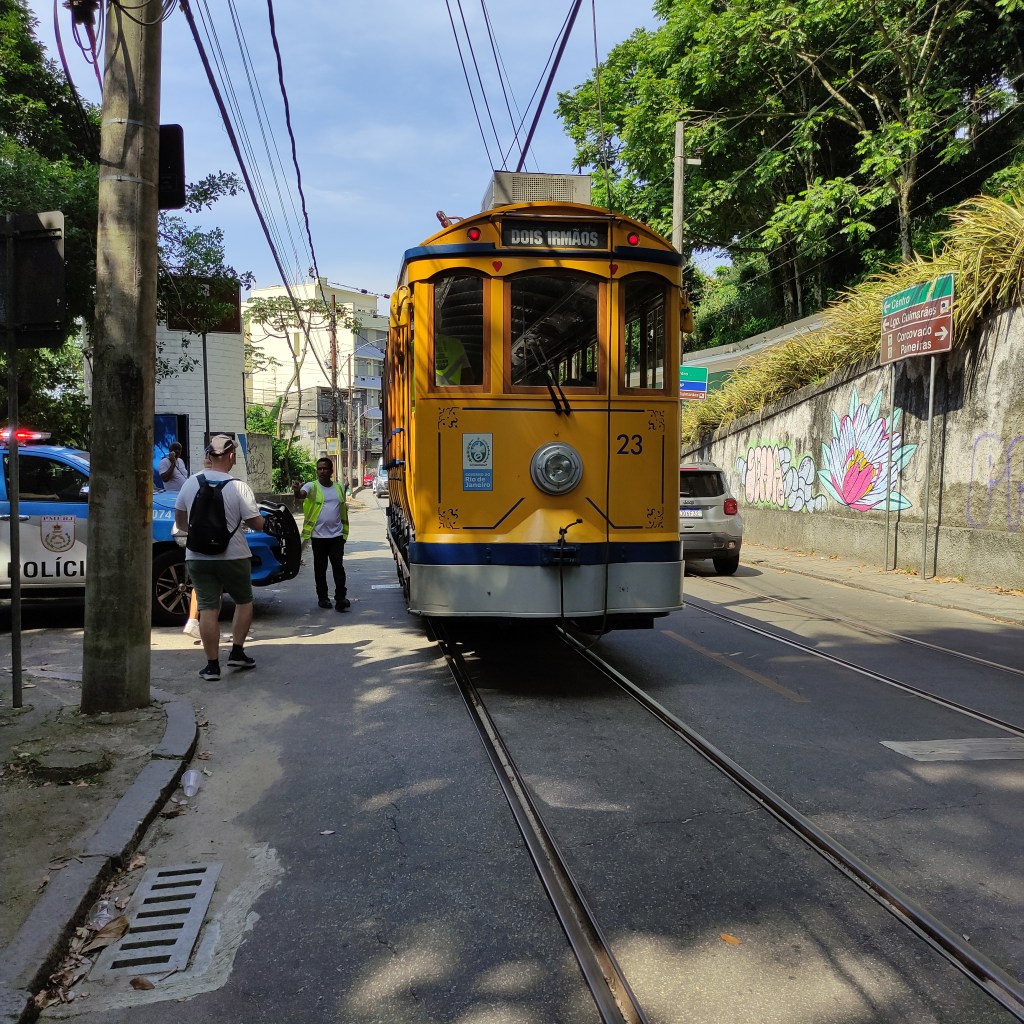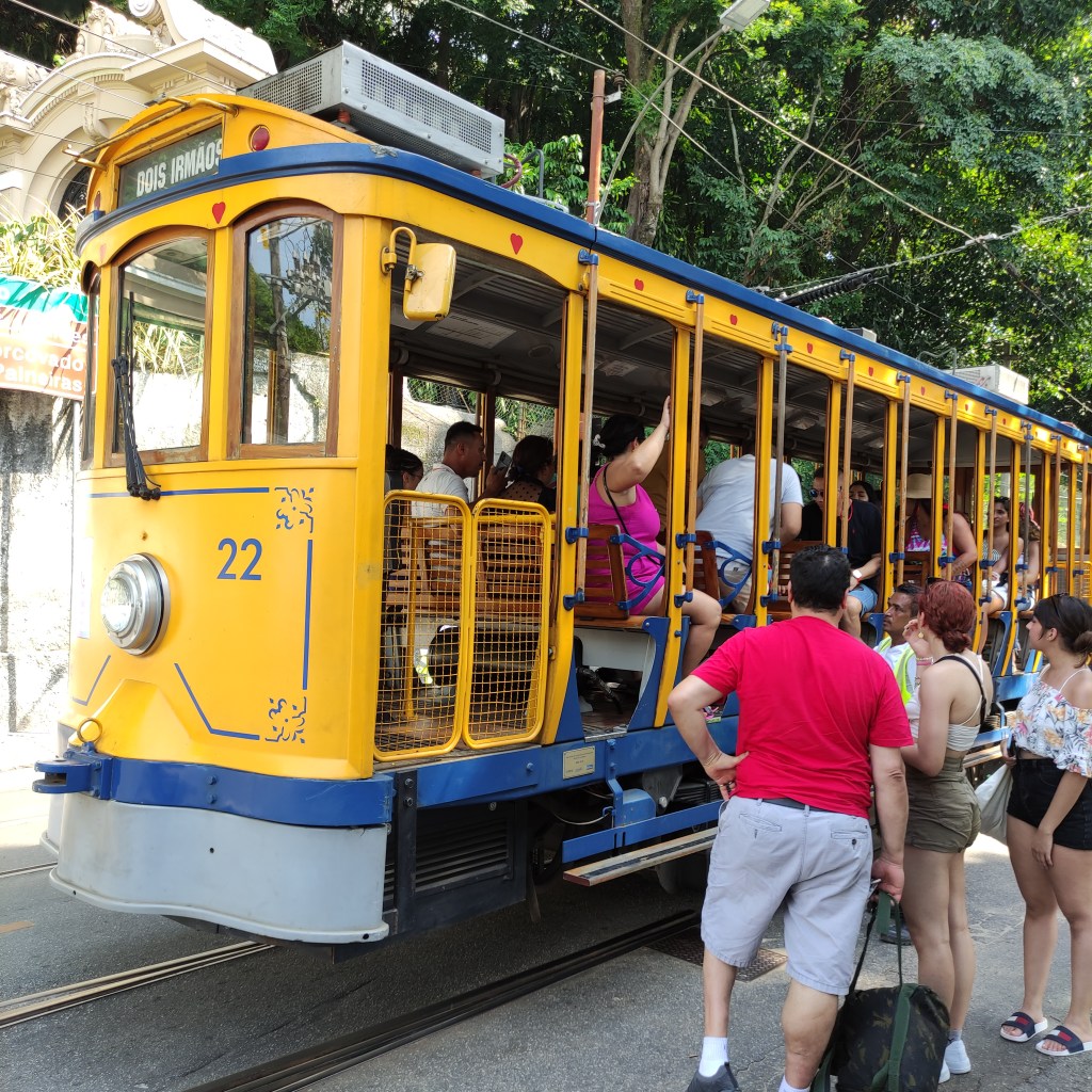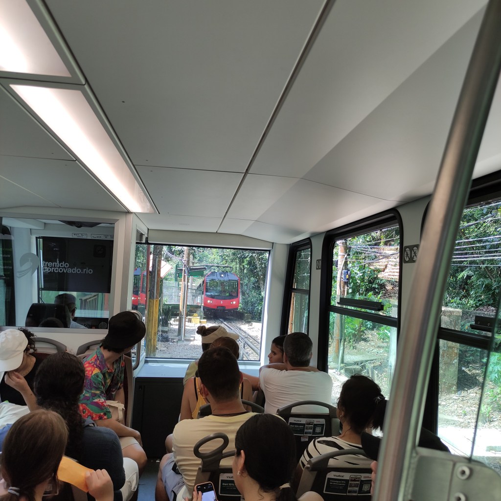 Il sabato 18.11.2023 era prevista la visita al Corcovado con l’immensa statua del Christo redendor. Dalla Praça São Judas Tadeu siamo saliti con il trenino a cremagliera fino sul morro dove si erige la famosa statua che sovrasta tutta la città di Rio. La temperatura era altissima e lungo l’ultimo pezzo del percorso che si deve fare a piedi, ho visto diverse persone che stavano male. Con quella temperatura oltre i 50° il corpo si disidrata velocemente e bisogna essere molto cauti e bere tanto evitando di restare a lungo esposti ai raggi solari. Rientrati alla base della stazione abbiamo ripreso un Uber che ci ha portati a Dois Irmãos dove avremmo dovuto pendere il tram Santa Thereza per ridiscendere verso il centro alla Estação Carioca passando dal famoso viadotto Arco de Lapa. Purtroppo, a causa di lavori sulla strada il tram partiva un paio di kilometri più sotto e non essendo noi in possesso dei biglietti non potevamo salire visto che era pieno di turisti. Fatto sta che alla fine solo tre di noi sono comunque riusciti a salire sul prossimo tram (senza bigliatto) mentre io e l’altra coppia siamo scesi in centro con un Uber.