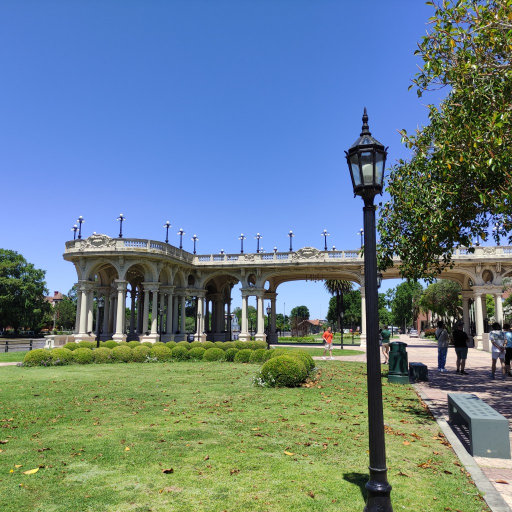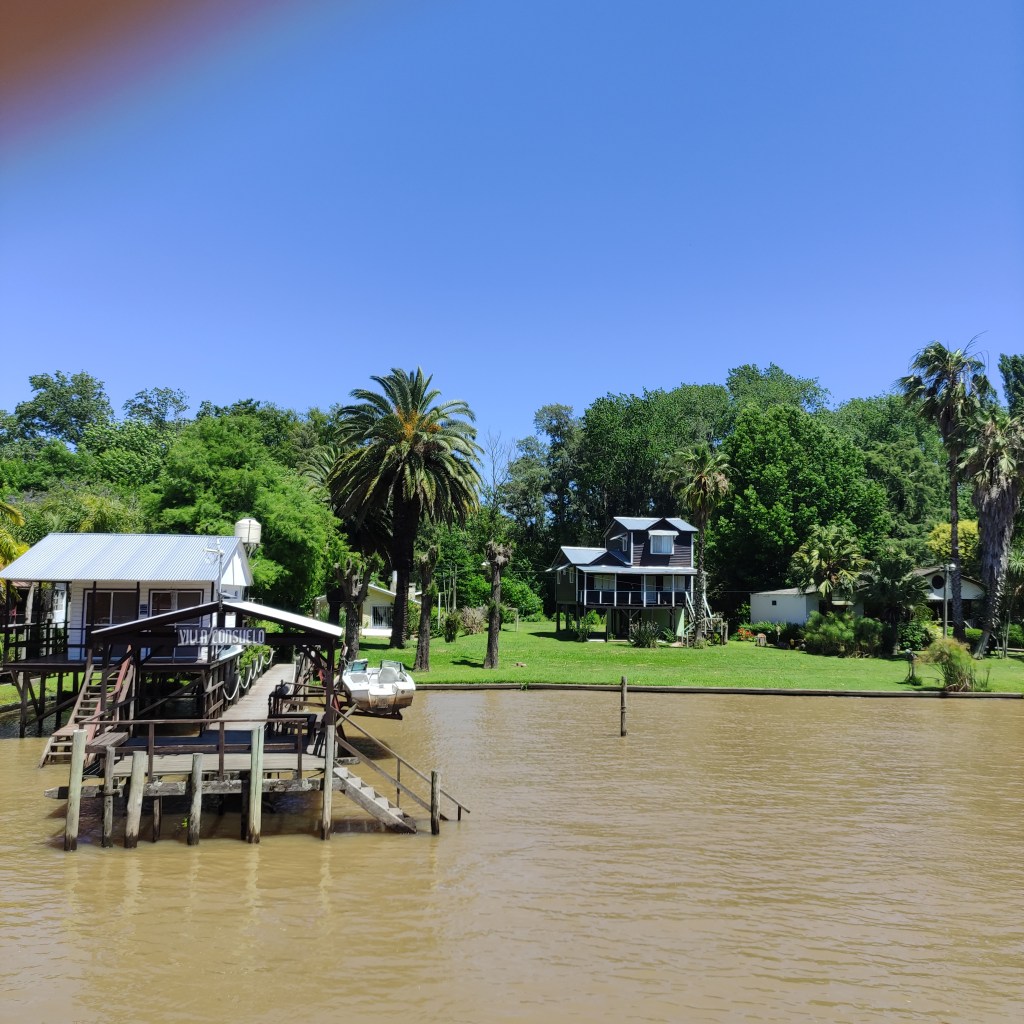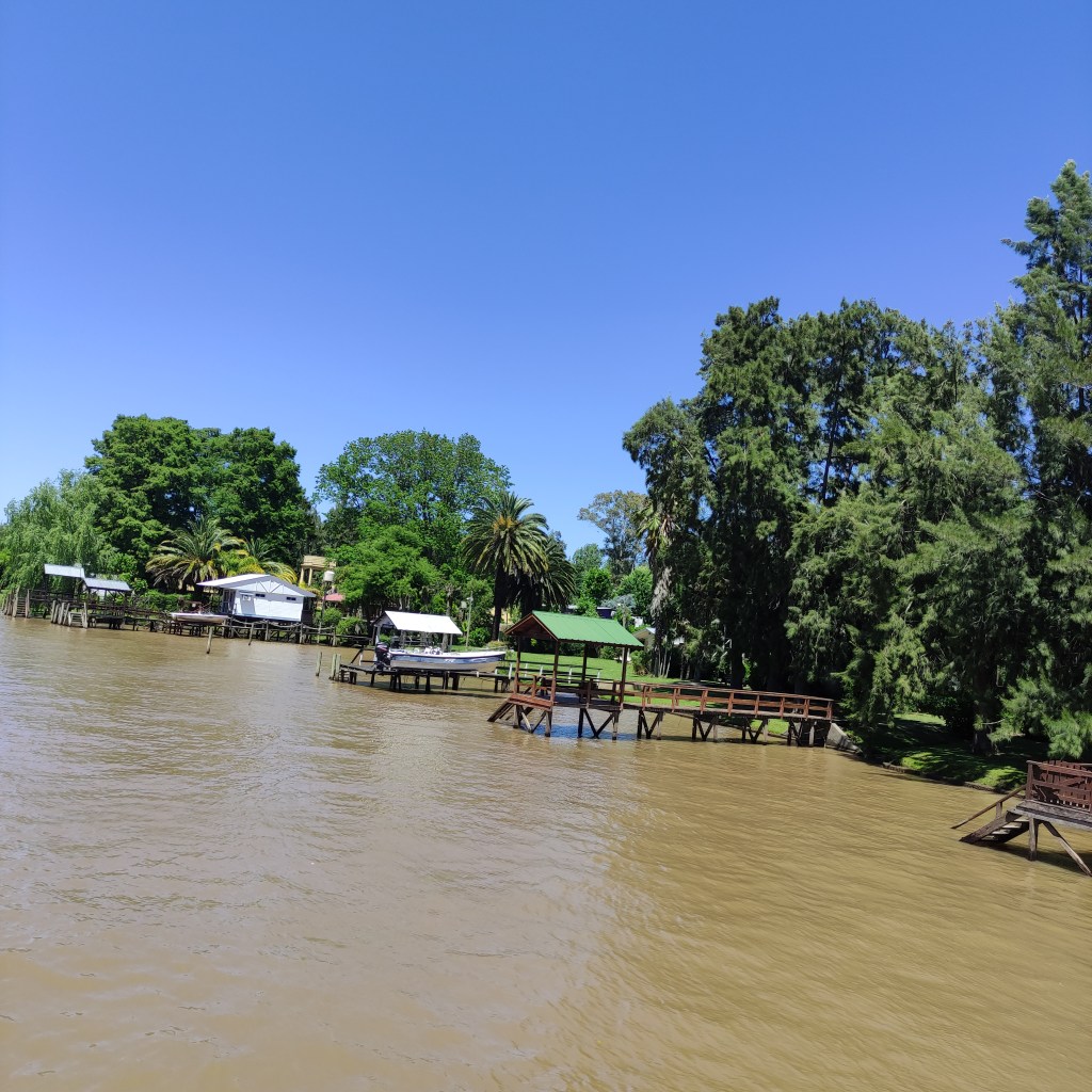 Mercoledì 22.11.2023 dopo la colazione, un bussino di un’agenzia di viaggi ci ha portati fino al porto (zona portuaria), dove abbiamo preso un battello-crociera che ci ha trasportati sul fiume Paranà. Per meglio carpire quell’atmosfera di quei luoghi, abbiamo navigato tra la natura ancora incontaminata del delta fino alla cittadina di Tigre che dista circa 30 km al nord della capitale Buones Aires, passando tra innumerevoli isoletti fluviali. Come spesso accade, il (troppo) turismo è buono per l’economia ma nuoce alla natura ancora selvaggia di alcune di queste isole, mentre altre presentano diverse strutture abitative tutte in legno e la maggior parte costruite riazate dal terreno per contrastare l’eventuale innalzamento delle acque. Ognuna di queste casette, molte delle quali sono dei “rifugi” per il fine settimana dei porteños, hanno il loro pontile d’attracco in quanto l’unico modo per arrivarci è per la via fluviale. Il sistema di trasporto locale è quindi garantito a barche-taxi usate dai locali. Per facilitare chi abita lì permanentemente, le suole ed il trasporto sono gratuiti; per fare gli acquisti di beni di consumo, c’è un’apposito barcone-negozio come pure anche la raccolta dei rifiuti è organizzata in modo simile. Il museo d’Arte di Tigre, un edificio storio dei primi del ‘900 e dove era luogo d’incontro dell’élite porteña (praticavano gli sport tennis e principalmente canotaggio), era però chiuso.