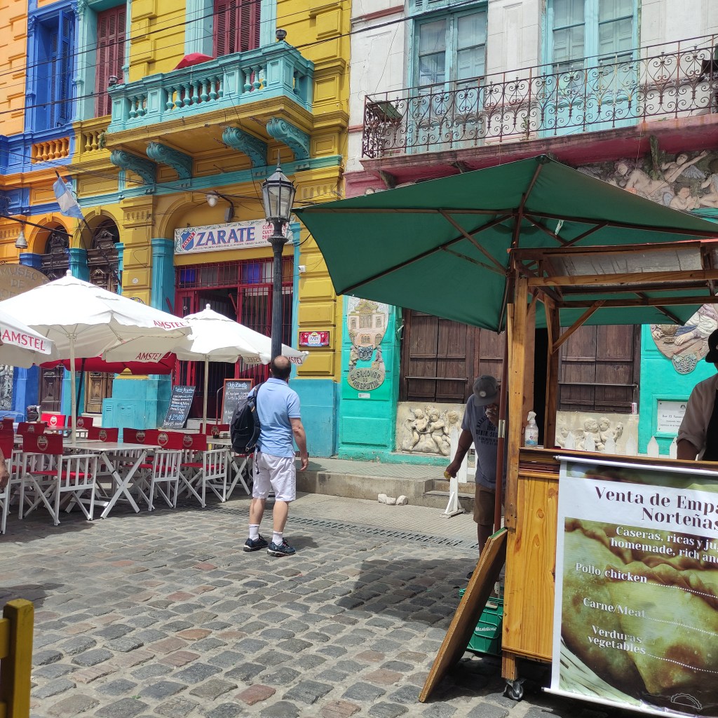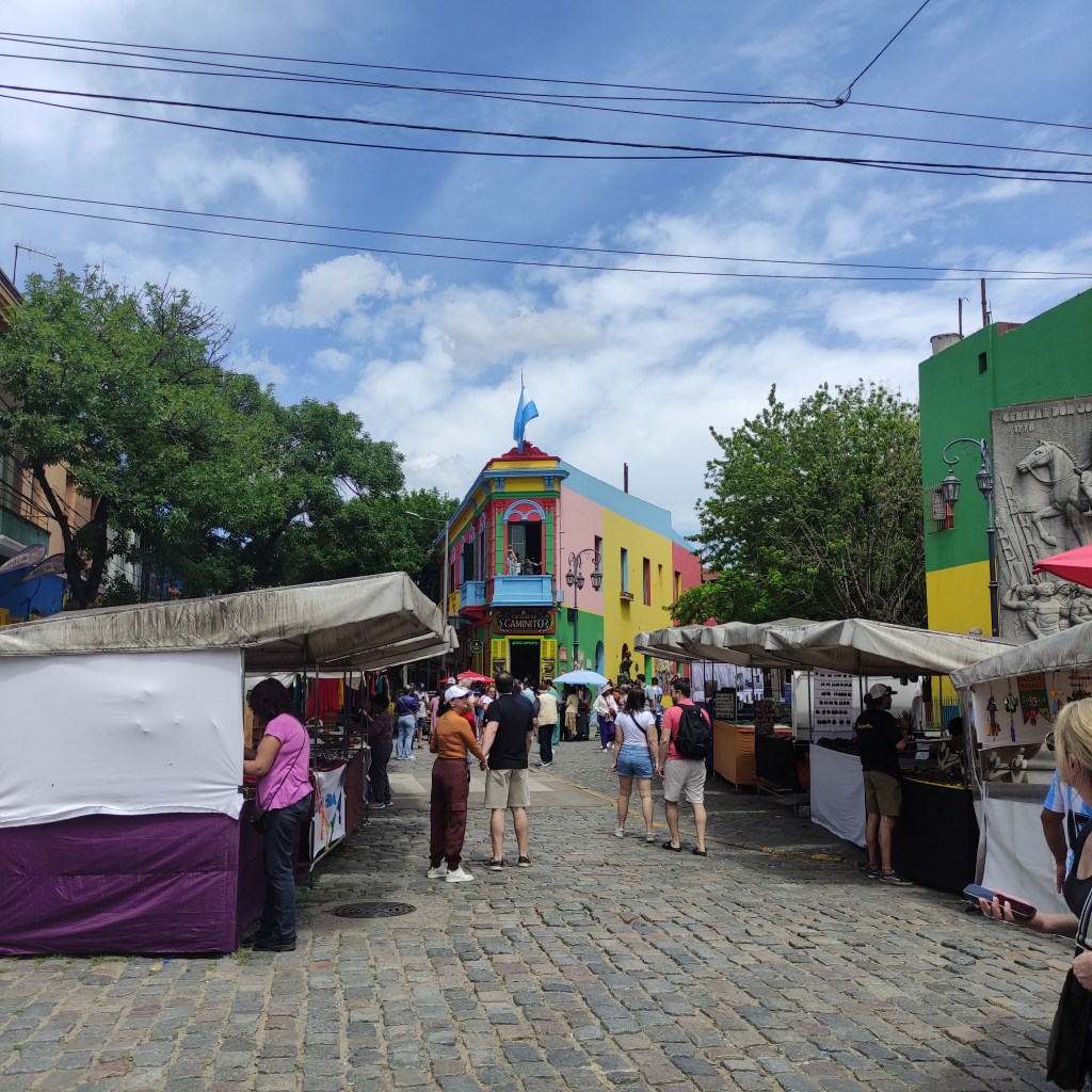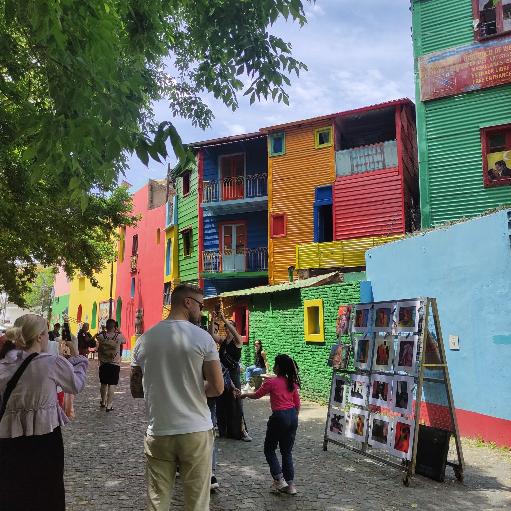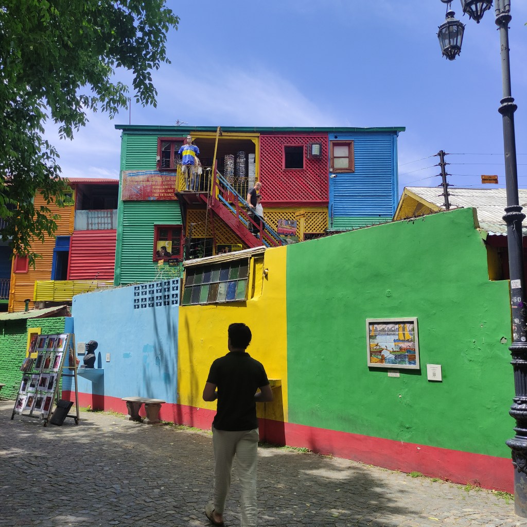 Giovedì 23.11.2023 con gli altri abbiamo fatto appuntamento alle 10:00 per passeggiare lungo il Caminito de la Boca che è una via variopinta dove gli edifici in lamiera variopinti ci riportano alle antiche origini di Buenos Aires. Questo luogo prese importanza culturale poiché ispirò nel 1926 il famoso Tango Caminito! Abbiamo poi curiosato tra le molte bancarelle che vendevano un pot pourri di cincaglierie: da oggetti antichi ad altri fatti appositamente per i turisti per mano di hippies moderni ma dalla foggia sessantottina. Siamo passati davanti alla chiesa di Sant’Telmo inizialmente dedicata a Nuestra Señora de Betlem, la cui costruzione cominciò nel 1734. Bella la sua facciata frontale in stile neobarocco, poi io ho perso il senso dell’orientamento. Ovunque, a stuzzicare i golosi, si trovano negozietti che mettono in bella mostra confezioni dei famosi “dulce de leche” che ti fa prender peso al solo guardarli… magari avrei anche potuto lasciarmi tentare visto che avevo camminato per più di 17 km.