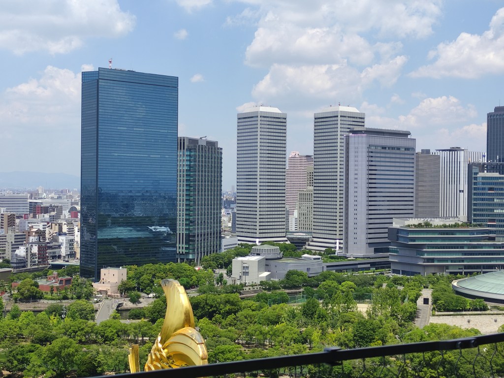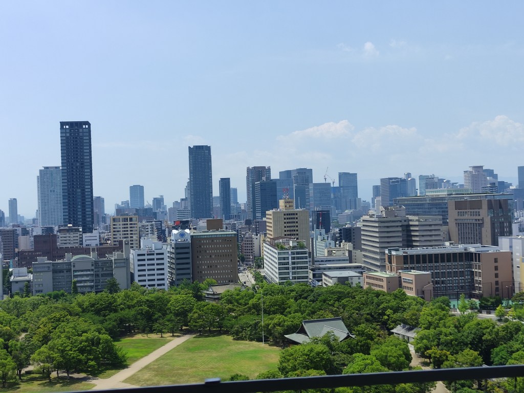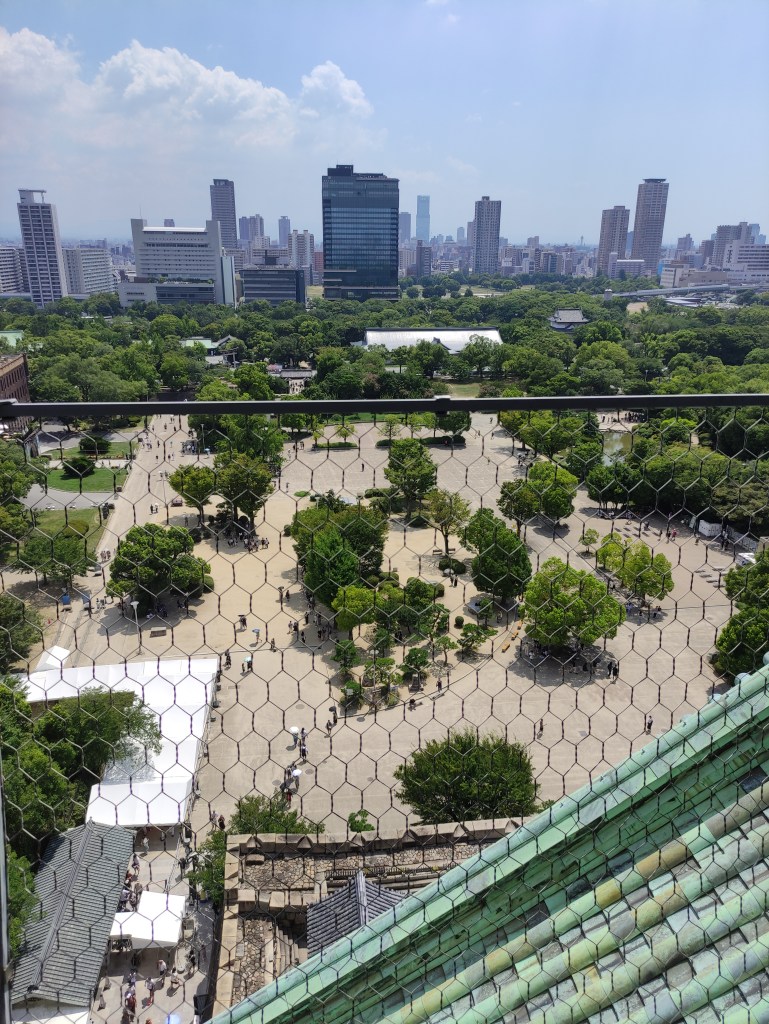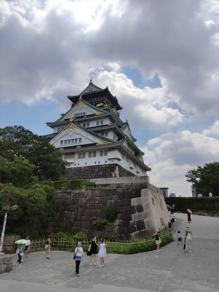 We visited Osaka Castle, always under a scorching sun and requiring liters and liters of fluids. The construction of the castle began in 1583 on the former site of the Ishiyama Honganji Temple. Toyotomi Hideyoshi, a military leader who in the 16th century intended the castle to become the center of a new unified Japan under his rule. It was the largest castle at the time. From one of its highest terraces, there was a beautiful view of the entire city.