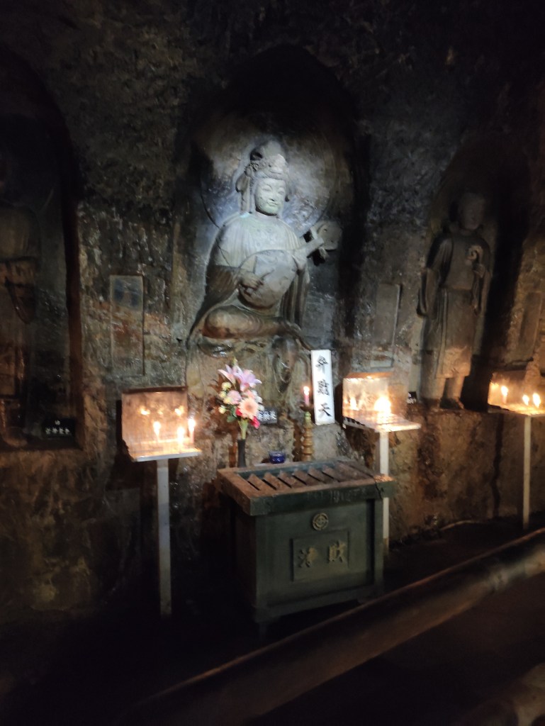 And then there is Bentenkutsu (in Hasedera) with its typical bright red โToriโ and cave temple. The statues inside are very old, but still hold relevance today. People still come to set lighted candles at their base and ask for help with various areas of life. The interactive nature of the cave is really unique. With a quite low ceiling can be difficult for those with a taller stature.