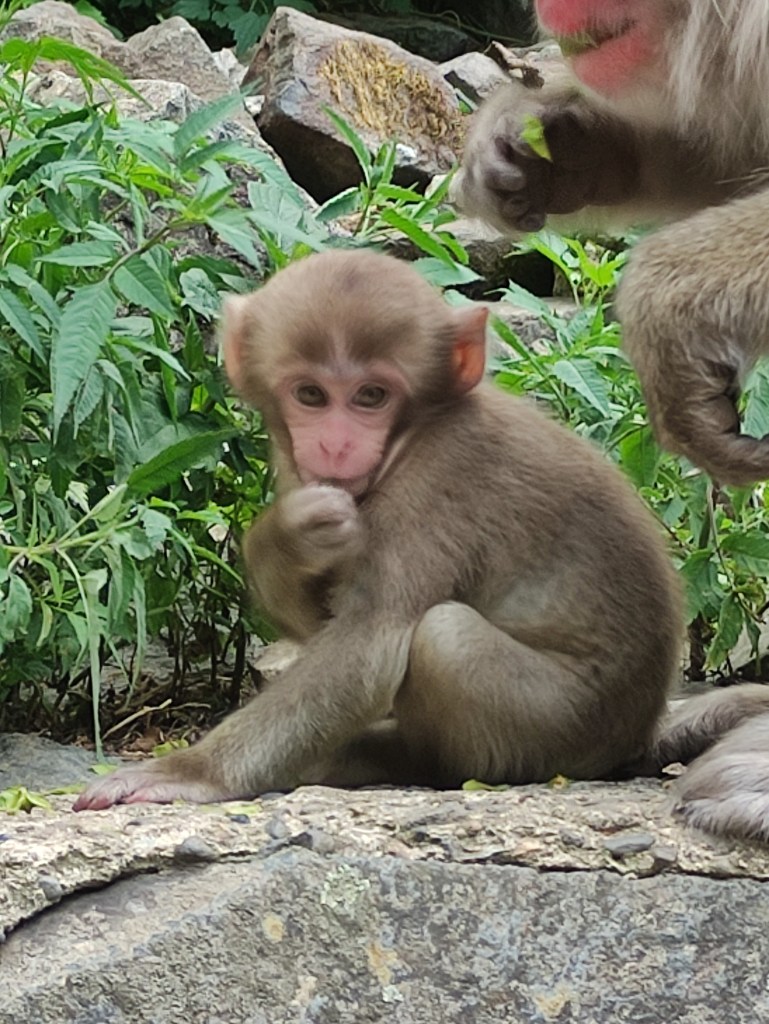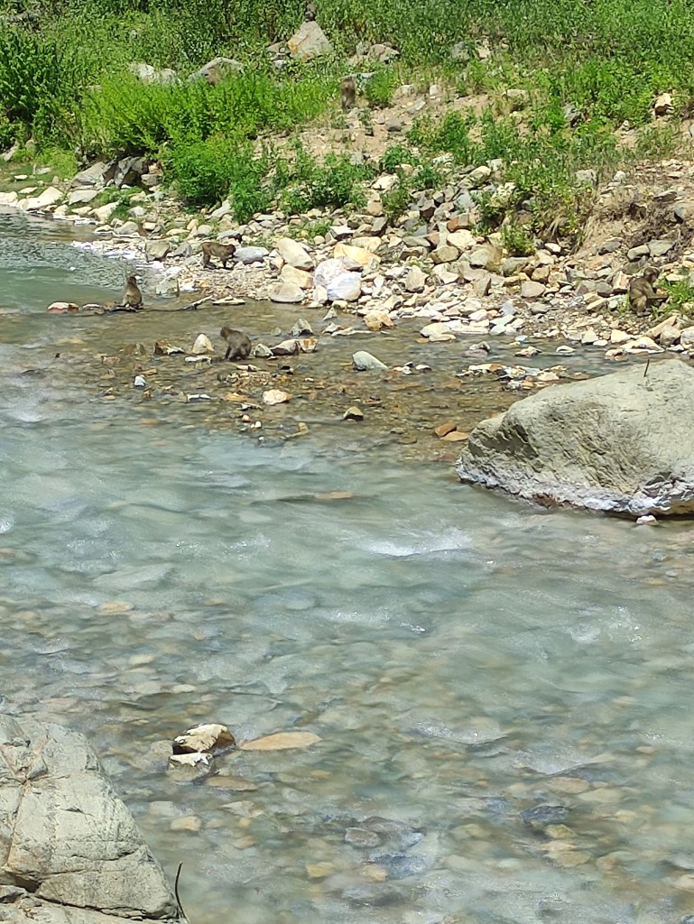 In the morning, the macaques come down from the woods above the large pool. Bathing is not just a winter habit: in the middle of summer, under the scorching sun, the water is perhaps a relief for them. One monkey in particular was interested in the design on my T-shirt, a red flag with a white whale from Paul Watson’s foundation. He touched my back very gently, and I admit I had a strange feelingโฆ it’s certainly easier to get empathy from a macaque than from a human being!
