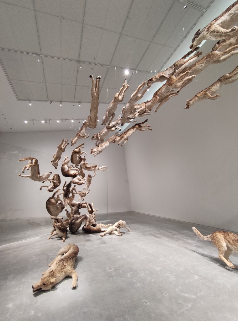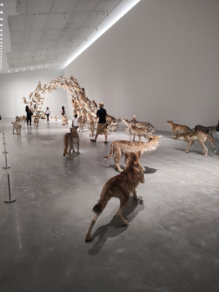 Of all the works on display, Cai Guo-Qiang’s Head On โ 99 wolves crash into a glass wall struck me as extremely controversial. Perhaps, given my sensitivity, I interpreted it as exploitation of wolves.