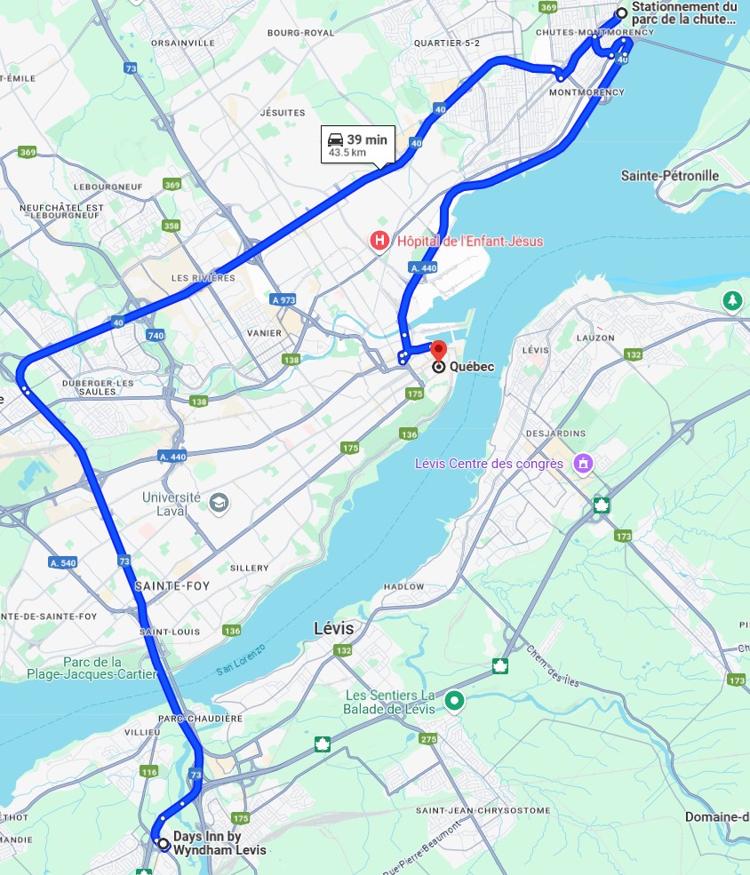 Wednesday 21 August 2024 (20th and 21st day, two nights) Time 9:17 – 18:15 4h 25′ ¦¦ total 49,4 km + 1h 50′ walkWe had breakfast at the hotel and left to visit Mont Morency Park and Falls.