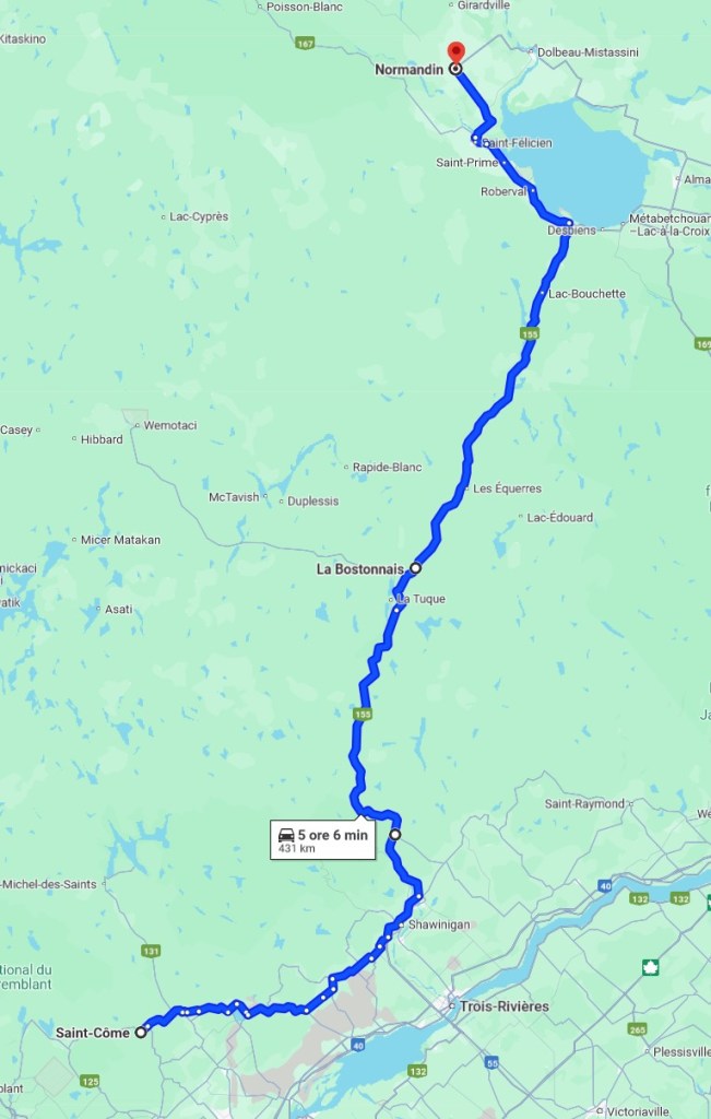 We left St.Côme relatively early because of the torrential rain, hoping that the bad weather would be short-lived. We were heading North-East towards Trois-Rivières and after a while, we turned North on the partly unpaved and pothole-filled highway No. 155. It was not the best idea, while the parts of the road where there was asphalt were forming puddles and there was a high risk of aquaplaning. We didn’t enter the Réserve faunique Mastigouche, but instead drived aside the Par national de la Mauricie. Therefore, a long route was planned, doubly tiring because of bad weather. For this reason, we did not stop anywhere. It was planned one night at Les Gites Makadam – Normadin.