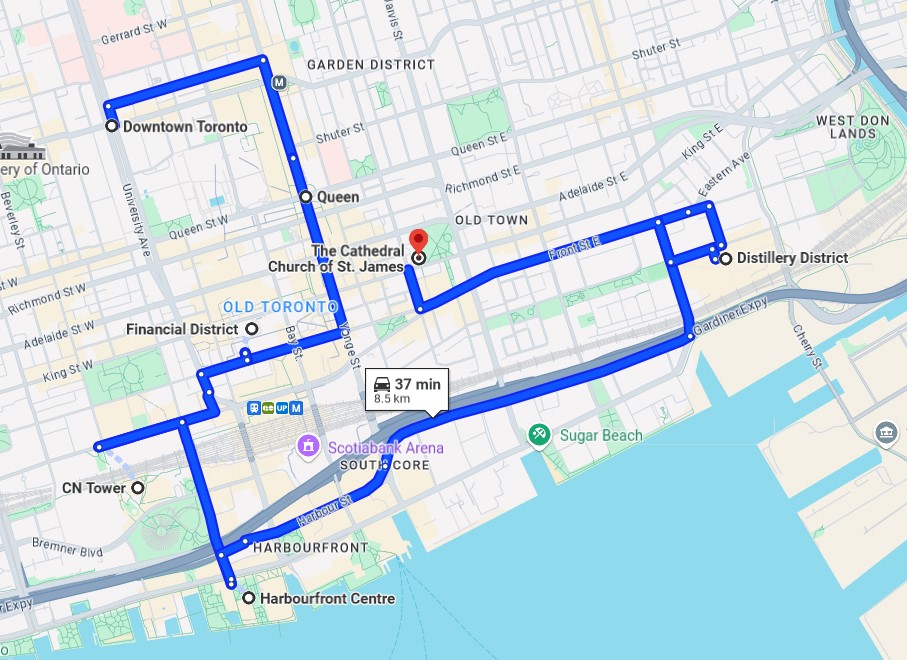 We took an huber to reach Kennedy’s Metro station (~20 min. ride). We got out at Quenn’s Station and started our tour from the Financial District. A must see is the CN Tower which is perhaps Toronto’s most famous landmark. It stands 553.33 metres tall and is the sixth tallest freestanding structure in the world, also named one of the seven wonders of the modern world. You can take a glass lift up to the glass platform with a view from 342 metres down (not for me, I suffer from vertigo). We reached the pier and skirted the Lake Ontario for quite a bit to the Distillery District where we had lunch (St.Lawrence Market was closed). The historic district includes 40 buildings and 10 streets, and its historic preservation houses the largest collection of Victorian-era industrial architecture in North America. The heart of the district is the Gooderham & Worts distillery founded in 1832 (considered the largest in the world at the time). Stores within the market sell everything-being a cosmopolitan city Toronto can cater to anyone’s culinary needs. The presentation of fresh goods was accurate and the prices comparable to those in Switzerland. The St. James’ Cathedral was built in Gothic style over 24 years in 1874 and features the tallest bell tower in Canada.
